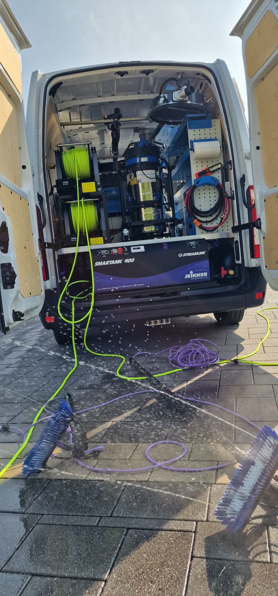 Mit Reinwasseranlage, Wassertank 400L und Durchlauferhitzer bis 80°C Reinwasser-Modus und Nieder/ Hochdruckreinigung bis 140°C heißes Wasser bieten wir Ihnen ein professionellen Service.